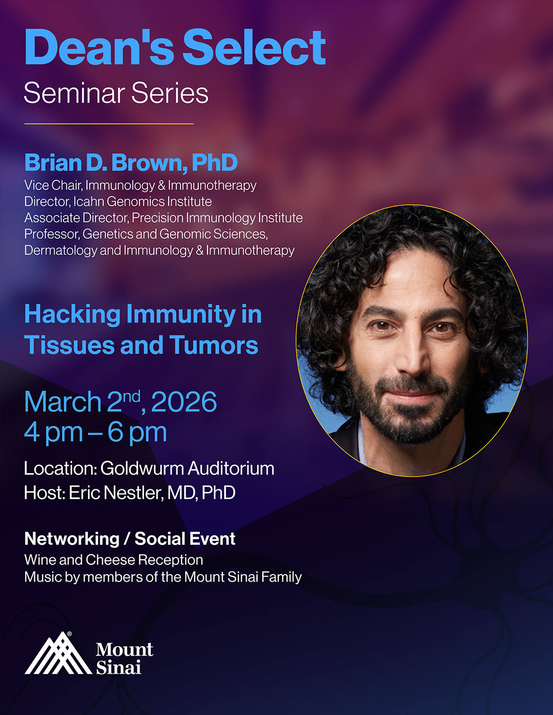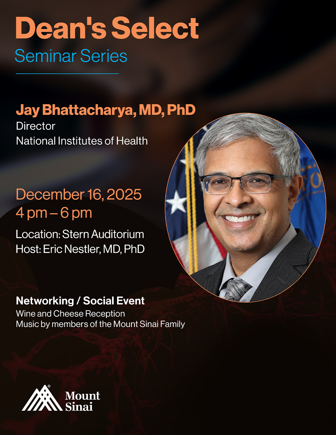 Mount Sinai’s mission is to radically advance biomedical science and healthcare through scholarly inquiry, collaborative learning, and humanism. To promote this work, please join us for our new early evening Dean’s Select Seminar Series. Each event will feature a ~40 minute presentation by a leading member of the Mount Sinai faculty or occasionally an invited guest, followed by a reception to provide opportunities to connect with the speaker, Mount Sinai leadership, and your colleagues. Musicians from the Mount Sinai family will perform. Please join us for this new way to engage with our One Mount Sinai community.